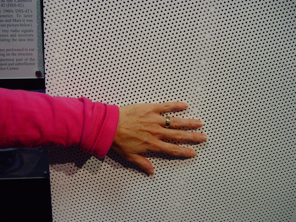 Dish panel for DSS-42 (decomissioned in 2000). The original DSS-42 was 26 meters across and was expanded to 34 meters for the missions to Venus and Mars. The perforations in the panels cut down on wind loading of the antenna (so they are not as buffeted by wind gusts). The surface accuracy of the panels is to within a fraction of the signal wavelength (or to within 0.5 mm). Though the perforations mean you can see through the panel in the visible band, the panel is opaque a radio wavelengths!