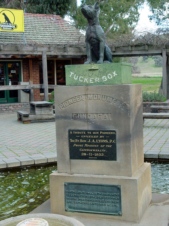 At five miles from Gundagai is this "Dog on the Tuckerbox" memorial. Supposedly based on an incident that occurred to a teamster named Bill the Bullocky on the road to Gundagai in the 1850s. While leading his bullock team and wagon across a creek five miles (or nine miles depending on the story) from Gundagai, Bill's wagon became hopelessly bogged in the creek. Trying to drag the wagon out of the bog, one of his bullocks then broke the wagon's yoke. Thereupon, Bill gave up the job and went to have his lunch. But here, to top off his run of bad luck, he found his dog sitting (or worse) on his tuckerbox (food box). The other bullockies thought the incident a great joke and one of them supposedly wrote a poem about it. In several versions, the poem spread the story of Bill's bad luck far and wide. (One old version of the poem is given below the picture.)