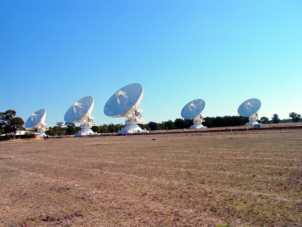 The Australia Telescope Compact Array is made of 6 dishes that can be placed such that the array is up to 6 km across. Five of the dishes (shown here) move along a 3-km rail track in the eat-west direction and also along a 230-meter north-south track. The sixth anntenna (not shown) is situated a further 3 km west of the main track. Arrays of telescopes are used to achieve the equivalent resolution (clarity) of a single large telescope, so the Compact Array could have the resolving power of a telescope 6-km in diameter (i.e., very high resolution!).