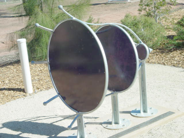 Sculpture at the Compact Array of the expansion of the universe showing four major phases of the universe's history from Big Bang to the cosmic microwave background to the first stars to the present day large-scale structure (galaxies in superclusters).